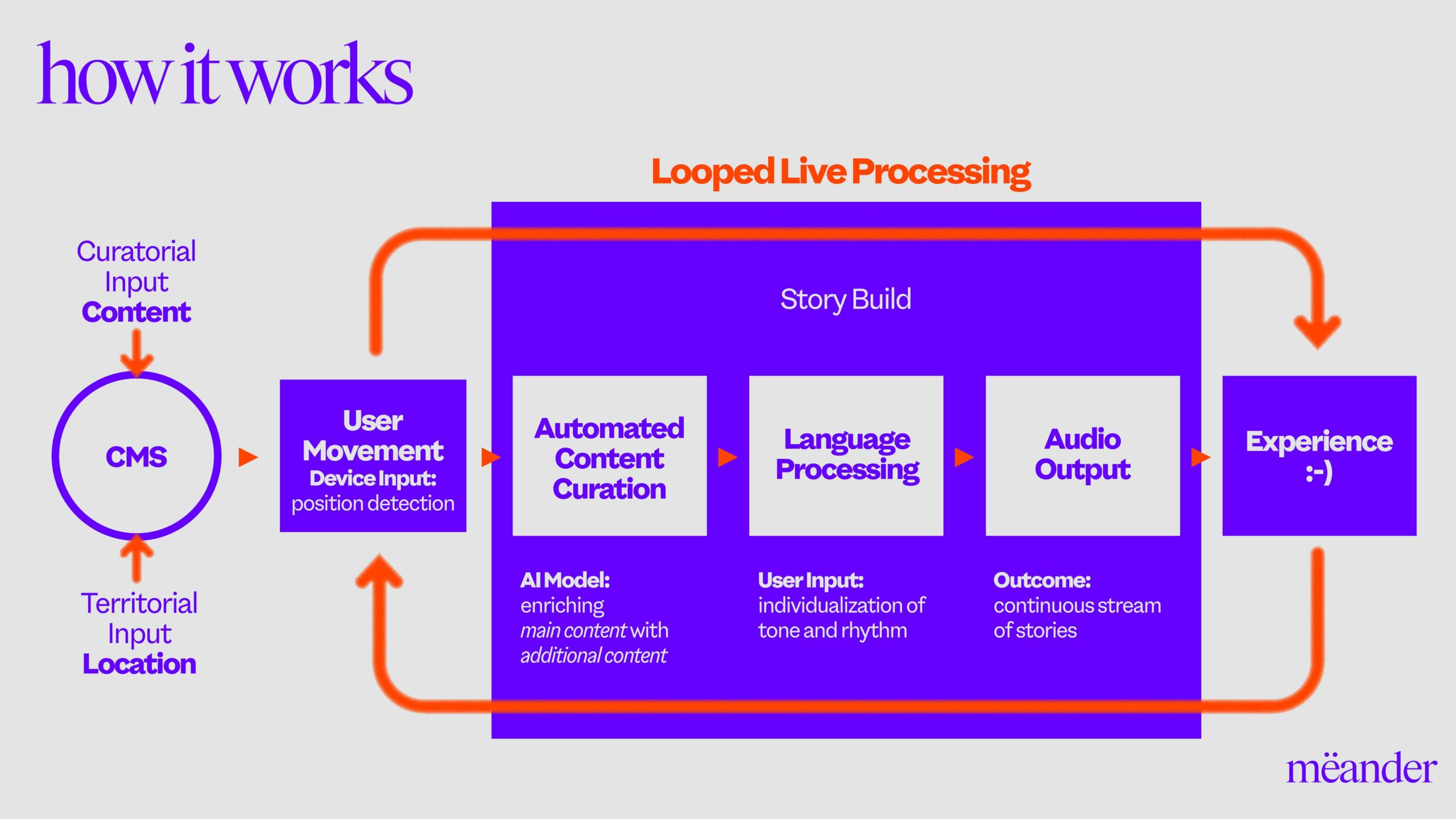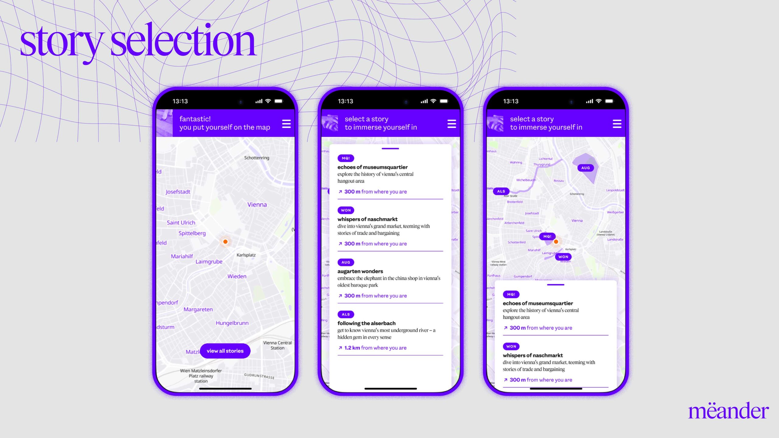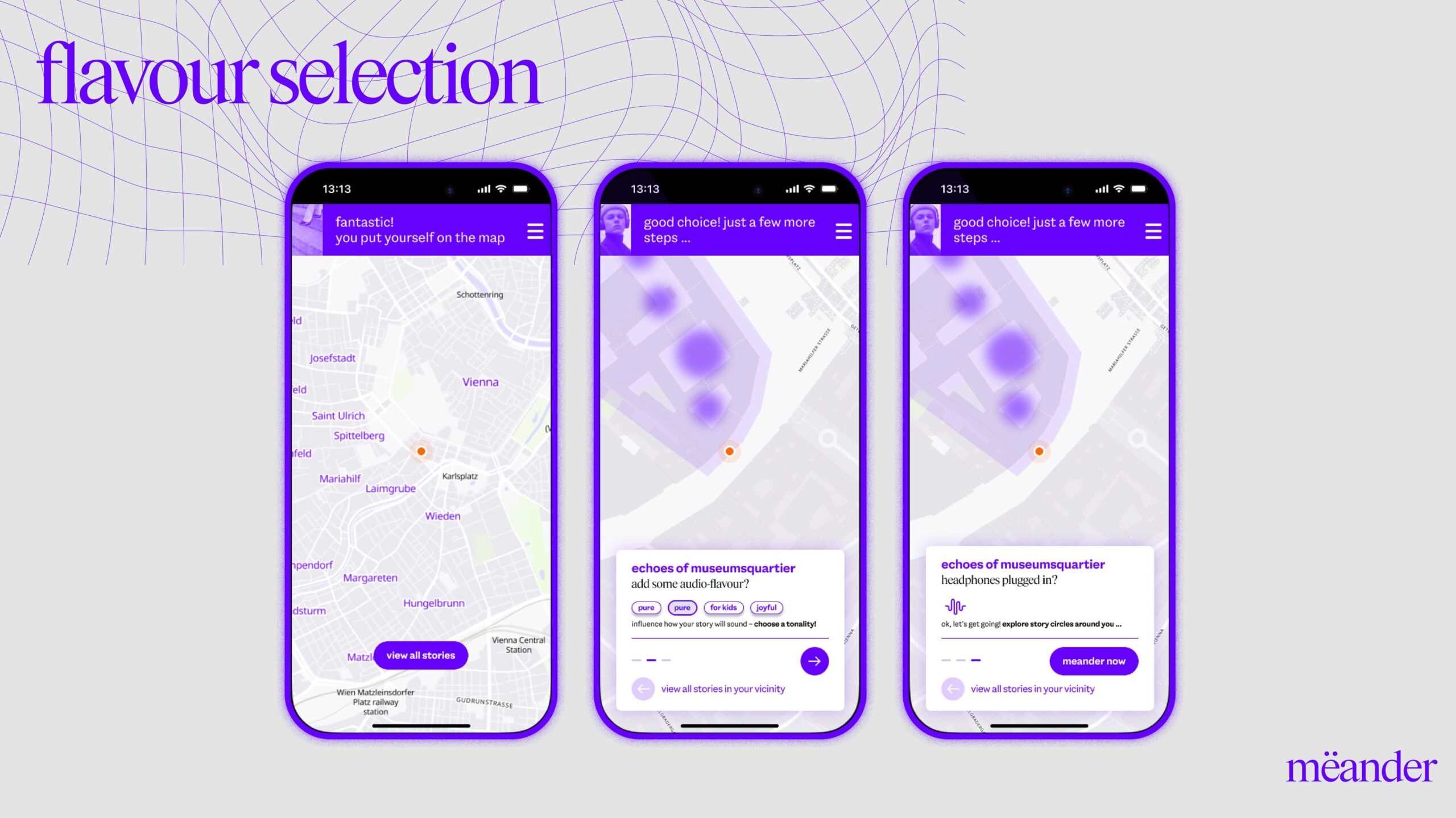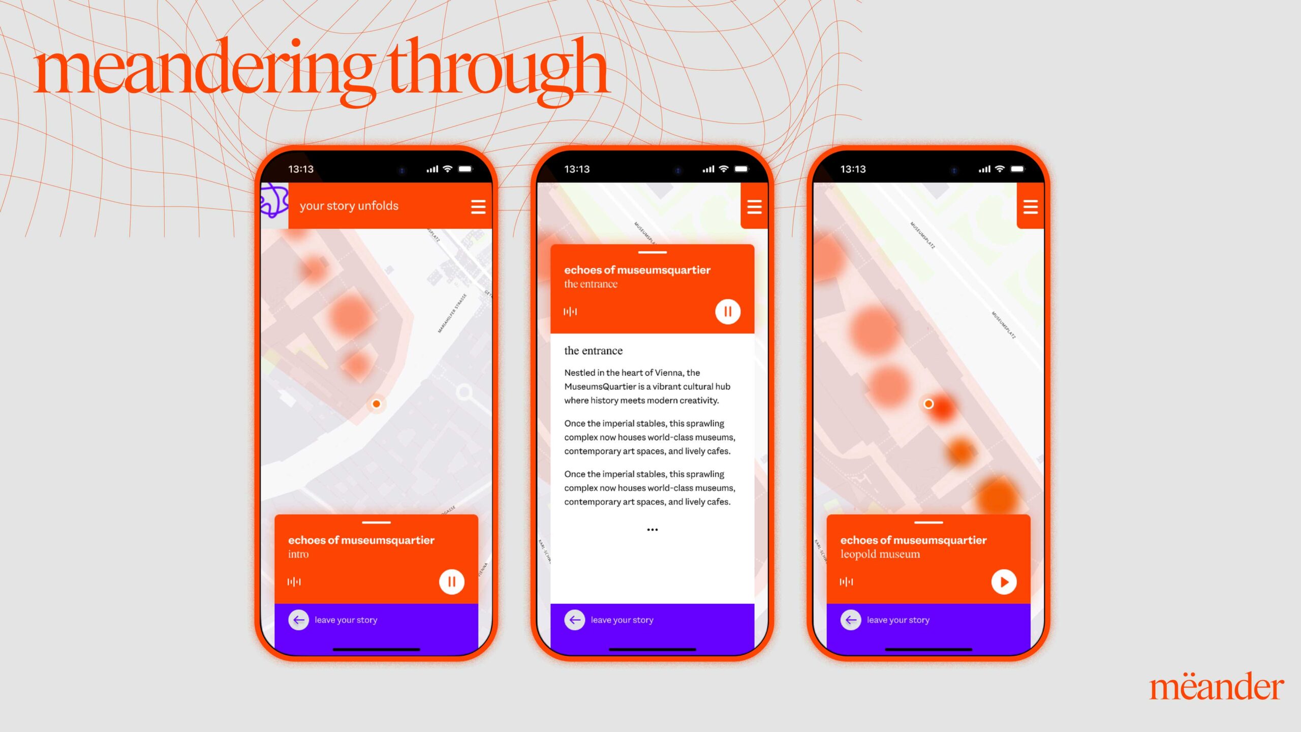 mëander ist eine KI-gestützte Augmented-Audio-Plattform für ortsbasierte Storytelling-Erlebnisse. Museen, Regionen, Kulturinstitutionen und Unternehmen können damit Inhalte auf völlig neue Weise vermitteln – standortbezogen, individuell und immersiv. .ber den „mëander Creator Hub“ können ausgewählte Partner:innen künftig selbst Inhalte erstellen, veröffentlichen und mit Besucher:innen interagieren – ganz ohne zusätzliche Hardware. mëander vereint technologische Innovation mit narrativer Kreativität – und öffnet neue Räume für digitales Kulturerleben.