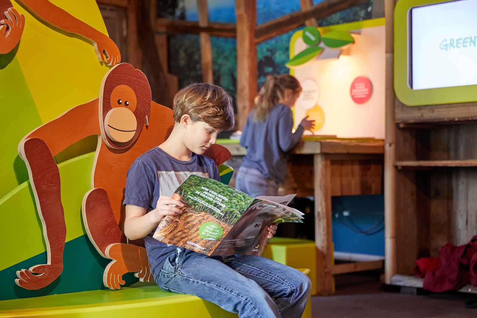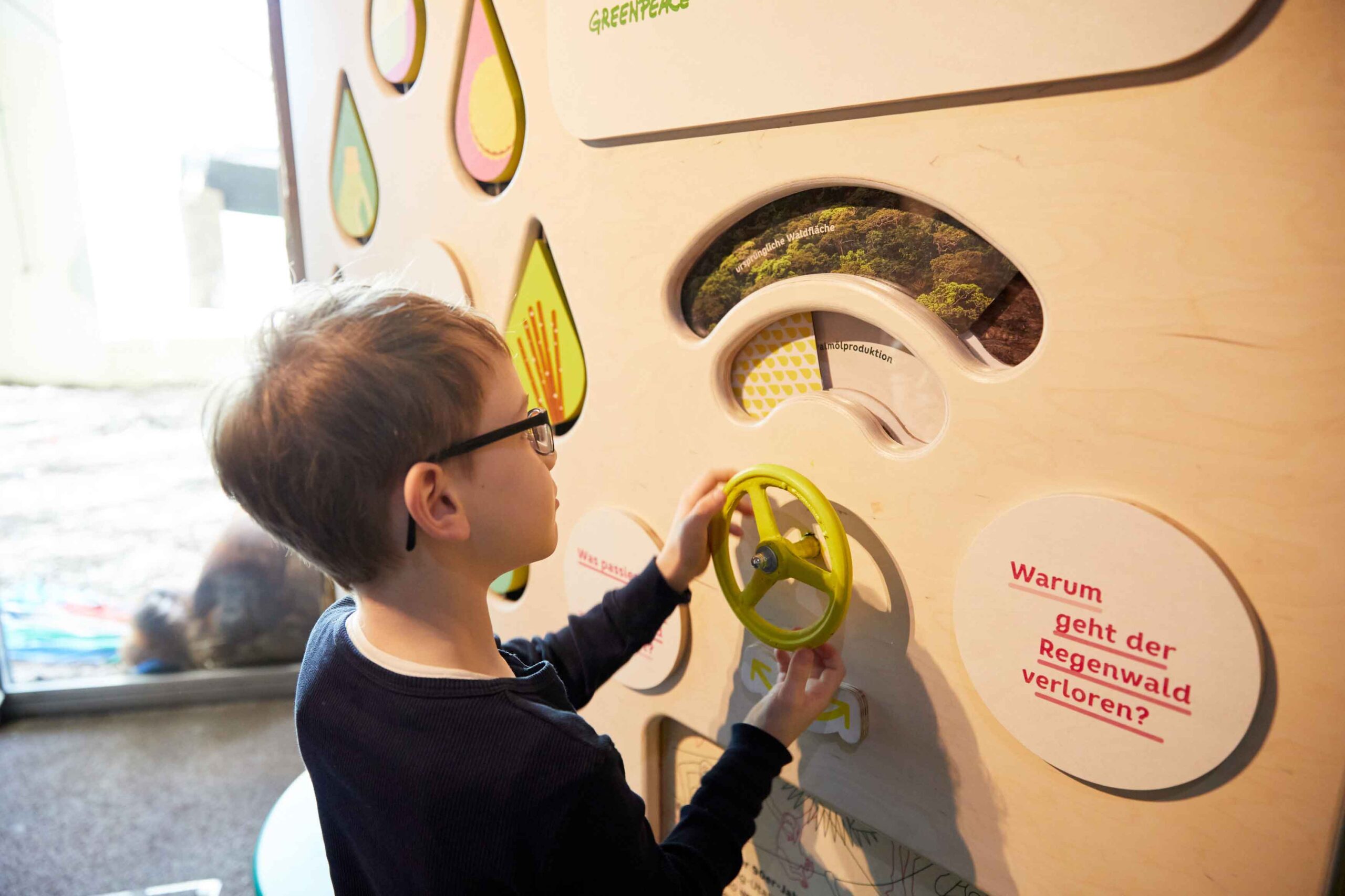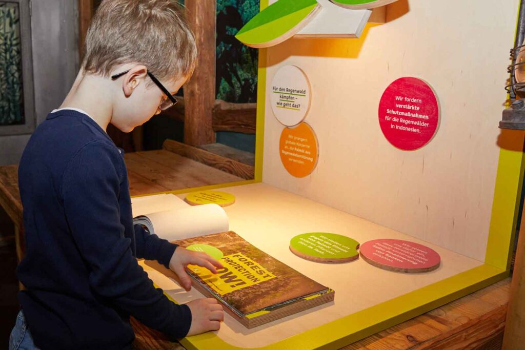 Spielerisch mit mehreren interaktiven Stationen, über Filmausschnitte und ein Fotobuch können in diesem Raum Kinder entdecken was es mit der Palmölindustrie auf sich hat. Diese Ausstellung bietet allen die sich engagieren wollen einfache Tipps für einen bewussten Konsum.